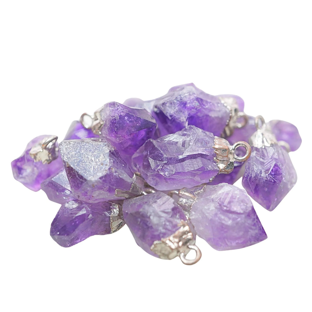 Amethyst Rough Shape Silver Electroplated Pendant Set (12 X 6 - 24 X 11 MM) showcases unpolished natural amethyst gemstones with a raw, organic look. The silver electroplated finish enhances its charm, making it ideal for boho and rustic jewelry designs. Available in a set of 2 for wholesale and bulk purchase.