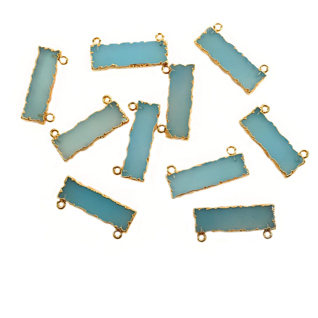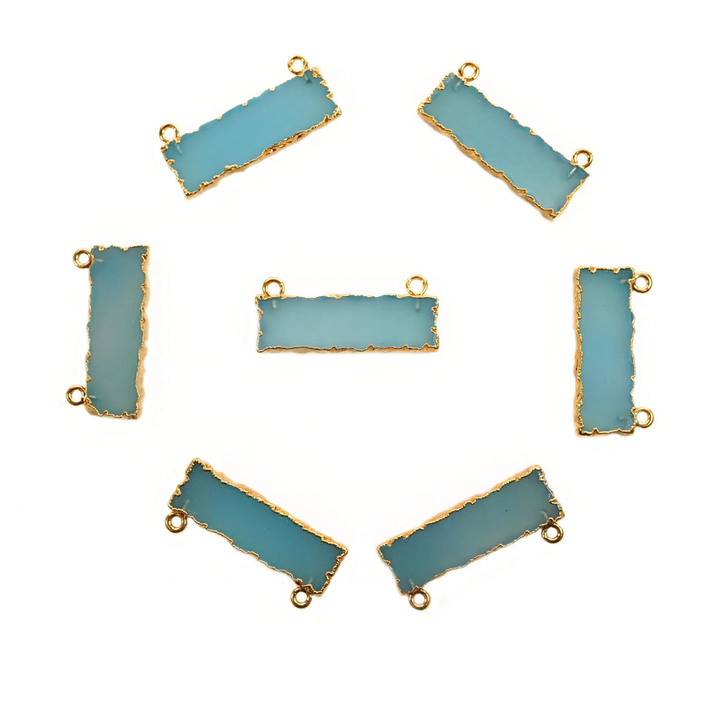 Bring a serene touch to your jewelry creations with this Aqua Chalcedony Gemstone Connector, known for its soothing ocean-blue hue. Crafted with a gold electroplated finish and dual bails, this rectangle connector ensures strength, shine, and effortless design flexibility. The sleek bar charm design complements modern and classic jewelry alike, making it a must-have for designers. Enhance your handmade pieces with the refined glow of Aqua Chalcedony and elevate every creation with timeless charm.