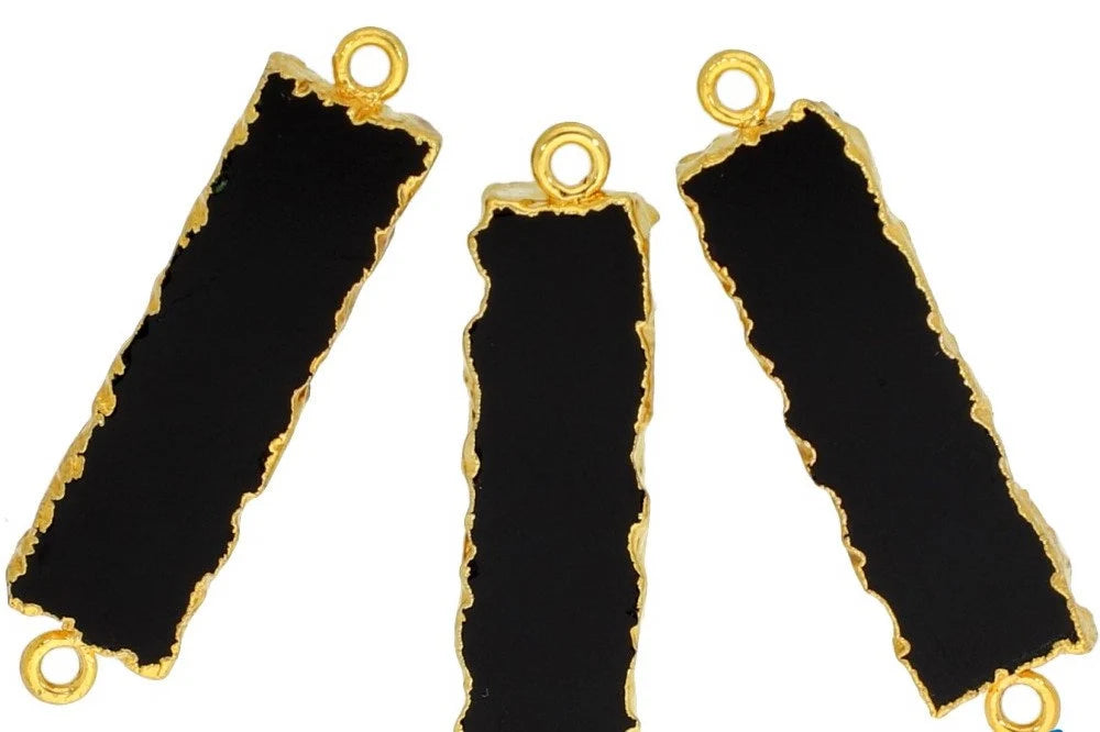 Craft stunning jewelry with the timeless elegance of the Black Onyx Gemstone, known for its deep, lustrous black hue that symbolizes strength and confidence. This gold electroplated charm connector combines durability with luxurious appeal, making it ideal for necklaces, bracelets, and earrings. The smooth rectangle connector design adds a modern and refined touch to any jewelry piece. Elevate your creations effortlessly with this versatile Black Onyx charm connector for a bold and classic finish.