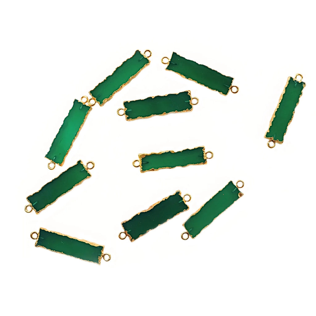 Add sophistication to your designs with this Green Onyx rectangle bar charm connector. The vibrant onyx gemstone showcases natural depth and rich green tones. Its gold-electroplated finish ensures lasting elegance and durability. Perfect as a bar charm, it connects jewelry elements seamlessly, ideal for bracelets, necklaces, and earrings. Elevate your creations with this versatile and stylish rectangle connector.