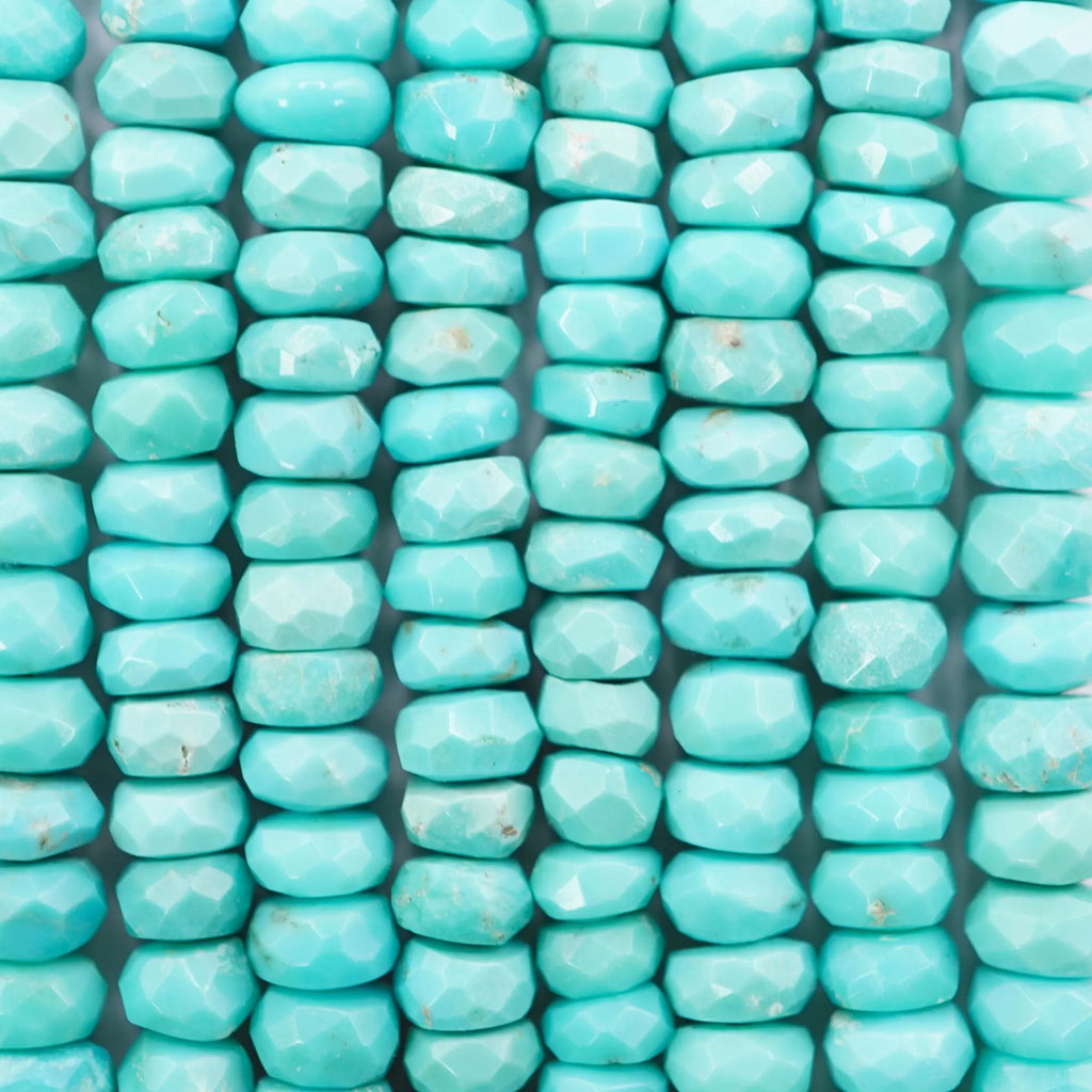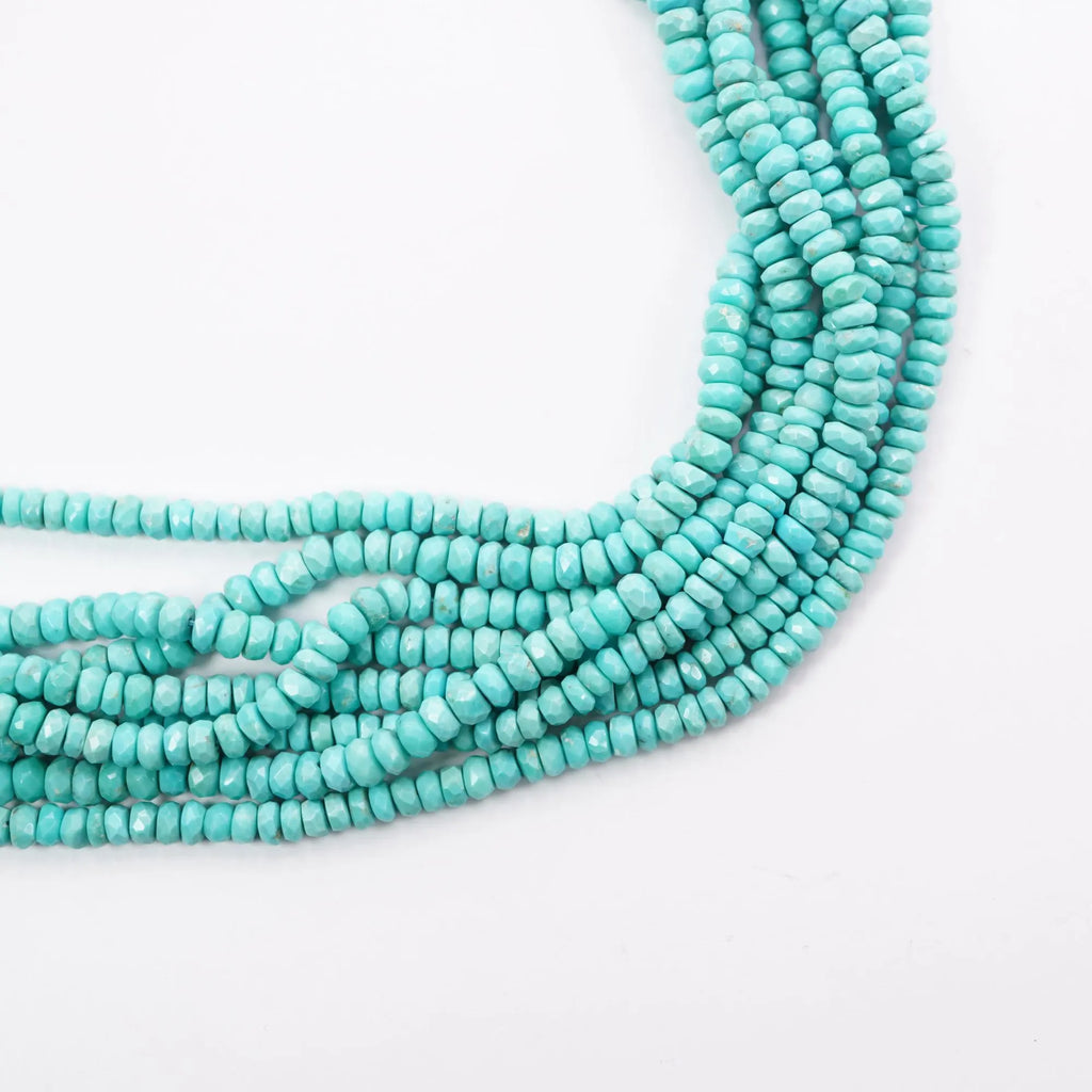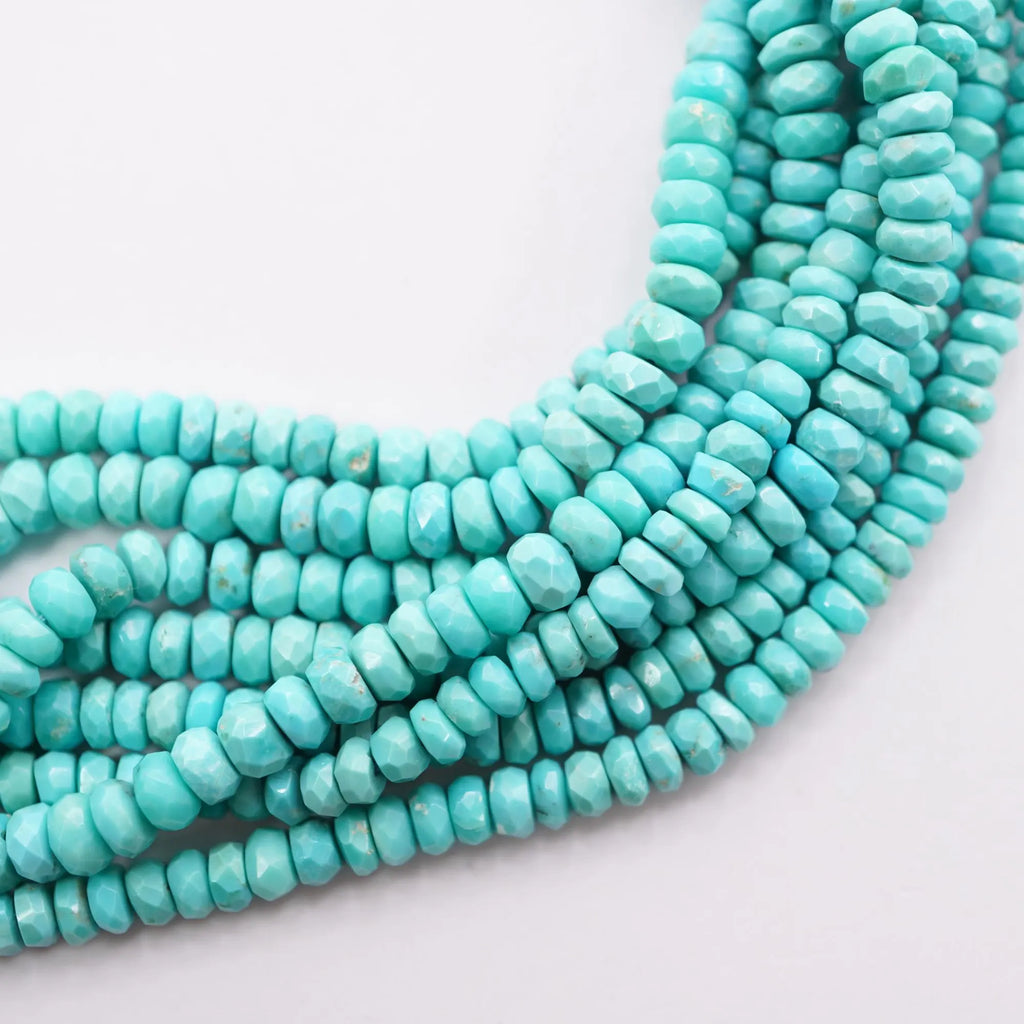 Elevate your jewelry designs with natural Kingman Mine Turquoise faceted rondelle beads. This 15-inch strand features 120-125 AA-quality 4-4.5mm beads, meticulously cut for a dazzling faceted finish. Crafted from premium USA-origin turquoise, these natural stones boast a 1mm drill hole for easy stringing and versatility.